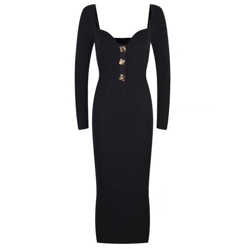 스퀘어넥 골드버튼 블랙 슬림바디콘 롱니트원피스 WFL0FQM