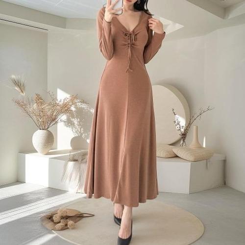 [옷자락]여자 무지 바스트 꼬임 긴팔 a라인 니트 롱 원피스