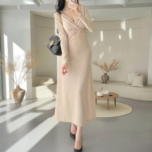 [다잇템][다잇템] 여자 V넥 잔주름 스웨터 롱 귀여운 바스트 원피스_23435857_588872