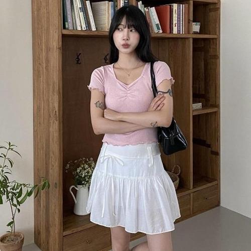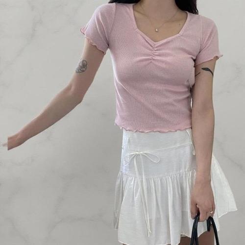 [다잇템][다잇템] 여자 V넥 잔주름 바스트 면혼방 프릴 반소매 티셔츠_23351054_588872