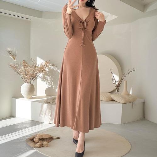 [옷자락]여자 러블리 바스트 셔링 브이넥 니트 롱 원피스