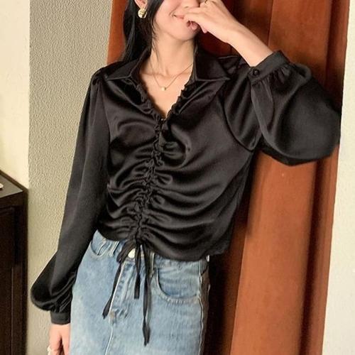 슈팅스타 / 심플 베이직 우아한 카라넥 바스트 플리츠 주름 긴팔 셔츠 B1103