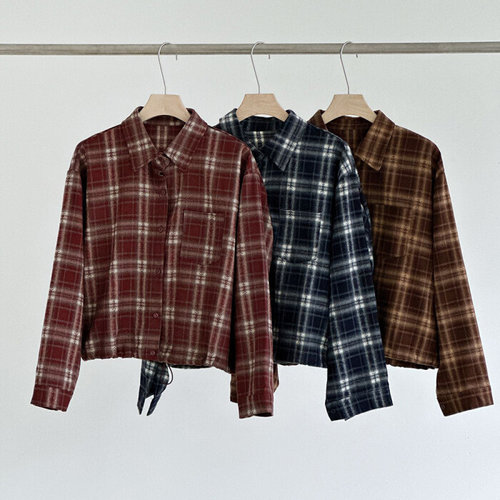 [옷자락]여성 체크 스트링 크롭 셔츠 포켓 도톰면 박스핏