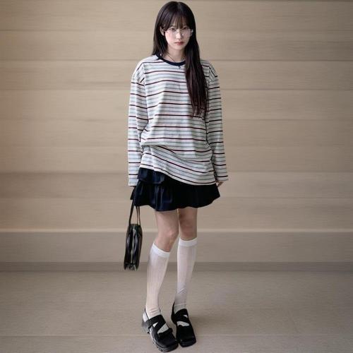 제임스 스트라이프 단가라 라운드 박스핏 코튼면 기본여성긴팔기본티 (5color)