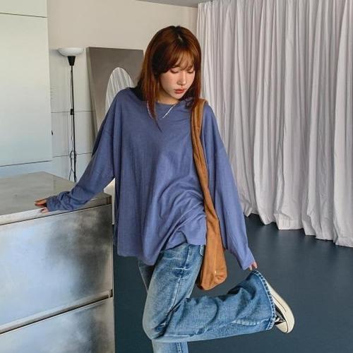 [옷자락]여성 단색 박스핏 사이드 슬릿 라운드넥 긴팔티