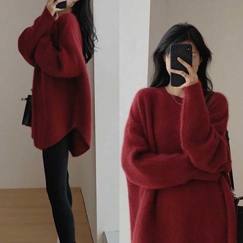 [셀럽하우스]여자 QGKE9514 가을 출근 룩 편안한 루즈 핏 박시 롱 니트 코디