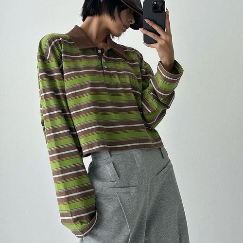 [옷자락] 여성 박시 세미크롭 배색 스트라이프 칼라 티