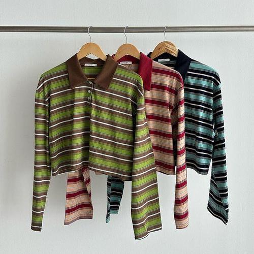 [옷자락]여성 박시 세미크롭 배색 스트라이프 칼라 티