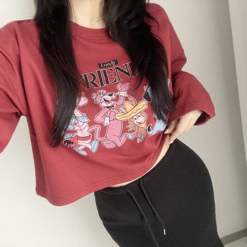 글램핏 / 프린팅 포인트 나염 박시 루즈핏 크롭 긴팔 간절기 티셔츠 3컬러