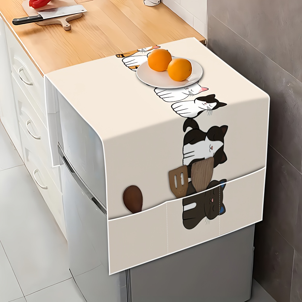 TEMU 1개 평면 고양이 큐프 냉장고 커버 - 귀여운 카툰 캐릭터 디자인, 내구성 폴리에스터 다용도 가전 커버 (싱글/더블 도어 냉장고, 전자레인지, 세탁기 & 건조기용), 장식 주방 액세서리, 재미있는 홈 데코, 쉬운 관리 소재, 애완동물 애호가를 위한 스토리지 포켓 포함