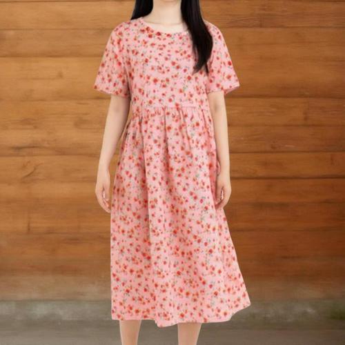 [옷자락] 여성 여유핏 면 패턴 반팔 A라인 잠옷 롱 드레스