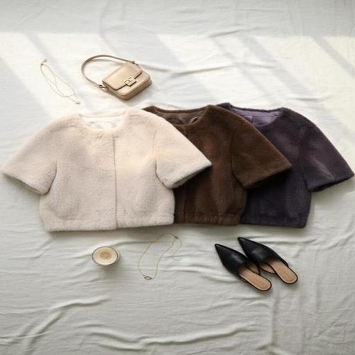 [다잇템][다잇템] 여성 반소매 귀여운 포근 카라없는 조끼 퍼 민무늬 자켓_23716357_588872