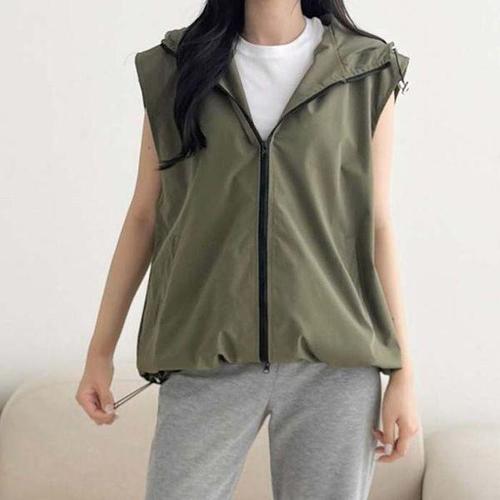 [에이치플러스몰]패션 베이직 데일리 커플 반팔조끼 립스탑 남녀공용 오버핏 스트링 후드조끼