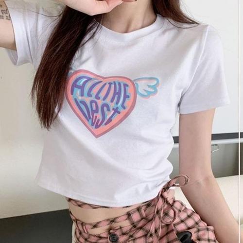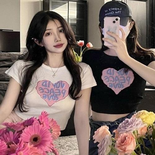 [엄지척]여성 슬림 크롭 반팔티셔츠 여름 하트 레터링 반팔티_19600944_667501