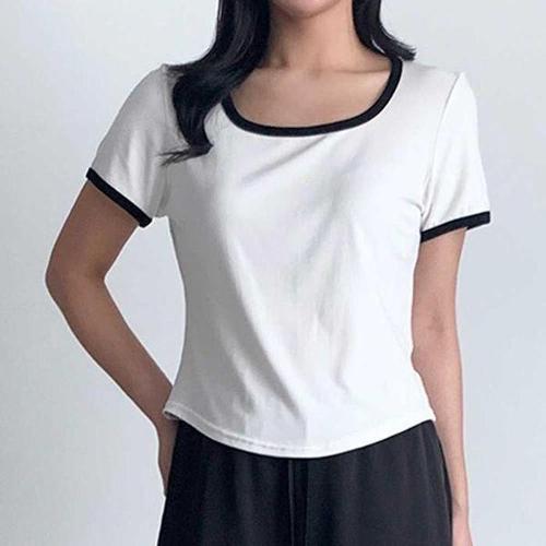 [옷자락]여성 사랑스러운 비스코스 컬러배색 슬림핏 스퀘어넥 반팔티셔츠