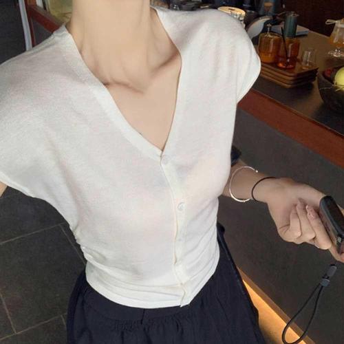 여름 출근 룩 여성 반팔 브이넥 가디건 니트 옆셔링 WFL6W39