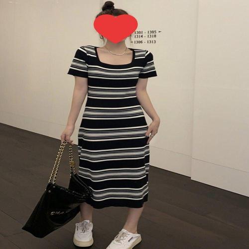 2컬러 단가라패턴 여름 스퀘어넥 슬림 반팔 롱원피스 WFNQVQ3