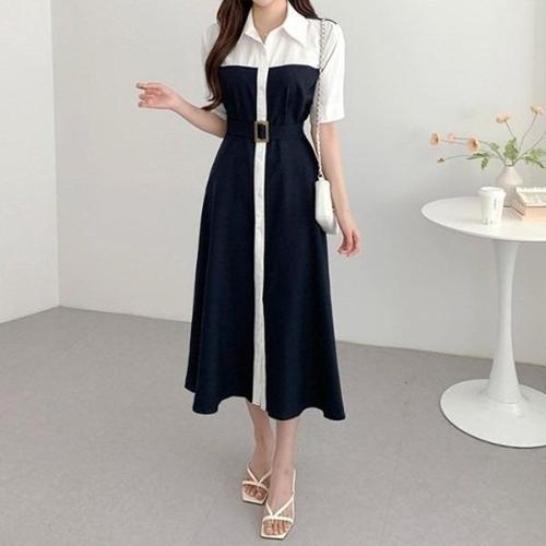 [옷자락]여자 하객룩 배색 벨티드 셔츠 반팔 롱 원피스