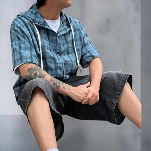 [옷자락]남성 커플 박스핏 후드 체크 반팔 셔츠 여름 가을