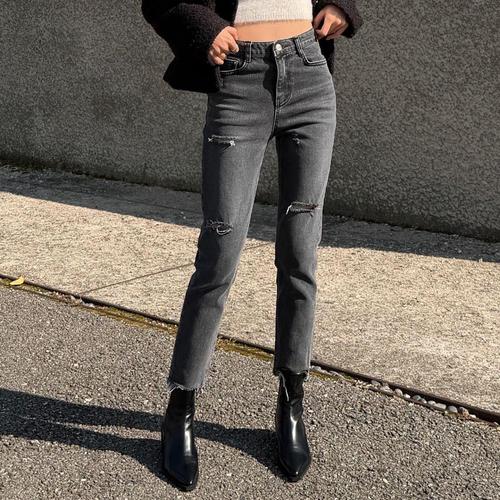 [옷자락]여자 블랙진 스키니 컷팅 구제 반하이 스판 청바지