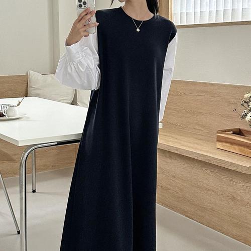 [샵앤][샵앤] 국산여성 라운드 오버핏 퍼프배색 임부 롱원피스 LL-WDR-4849-블랙