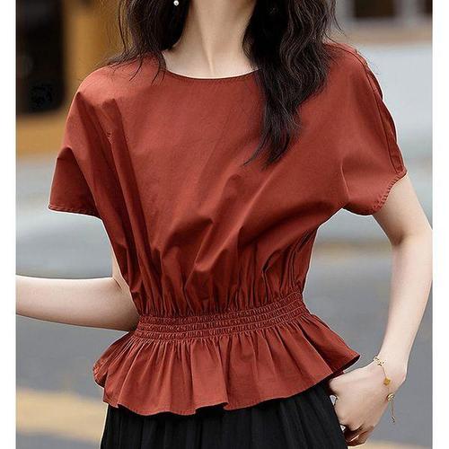 샵앤) 여성 라운드넥 밴딩셔링 루즈핏 페미닌 반팔 블라우스 CL-WBL0379