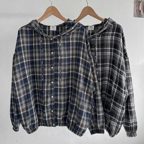 [옷자락]여성 빅사이즈 체크남방 후드 퍼프핏 밴딩 셔츠