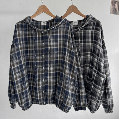 [옷자락] 여성 빅사이즈 체크남방 후드 퍼프핏 밴딩 셔츠