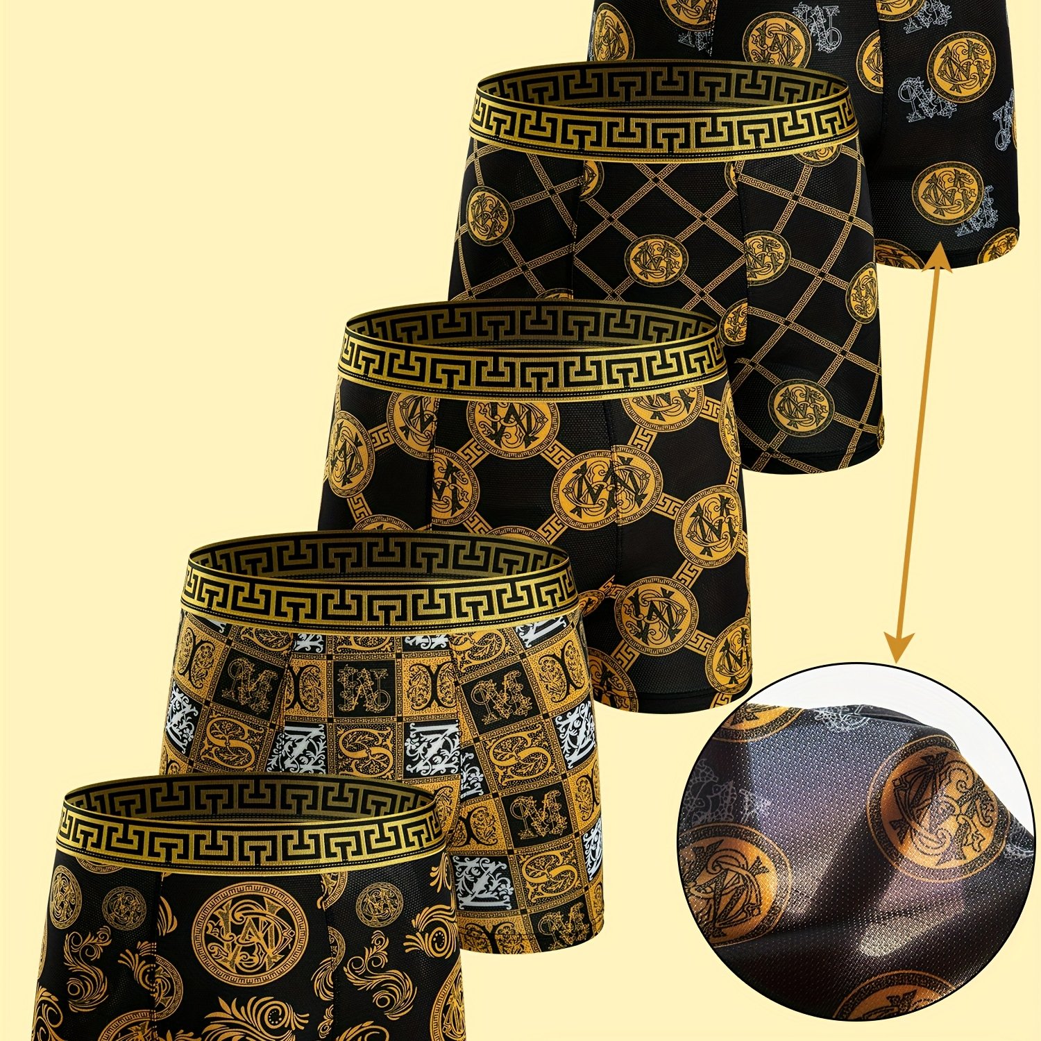 TEMU 5pcs 남성용 블랙 골든 박서 브리프 - 통기성, 신축성, 편안한 캐주얼 속옷, 세련된 기하학적 패턴, 일상적인 착용 또는 스포츠에 적합, 편안한 속옷 | 우아한 속옷 | 폴리에스터 혼방