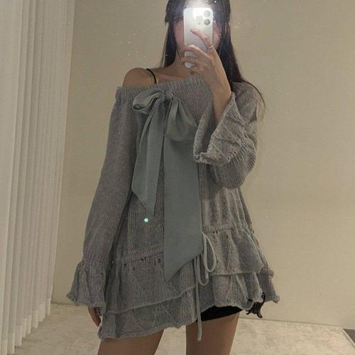 [다잇템]여자 벌룬 비침 프릴 왕리본 빅사이즈 니트