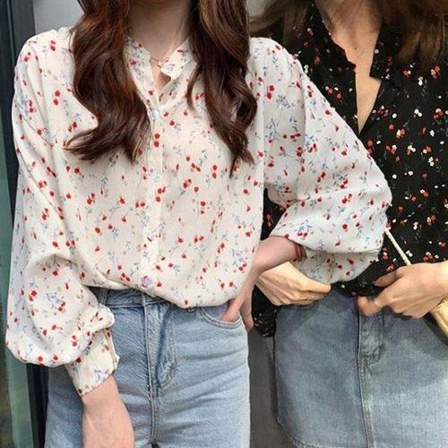 [셀러허브_여성트랜드패션]여성 벌룬 X 소매 퍼프 긴팔 블라우스 플라워