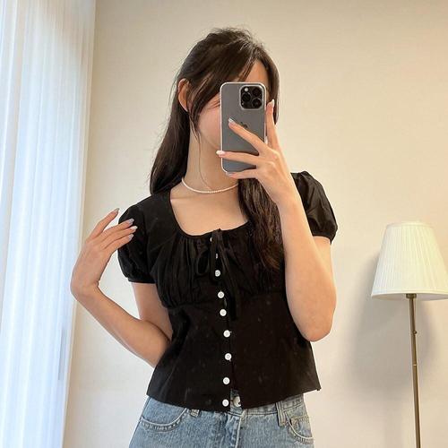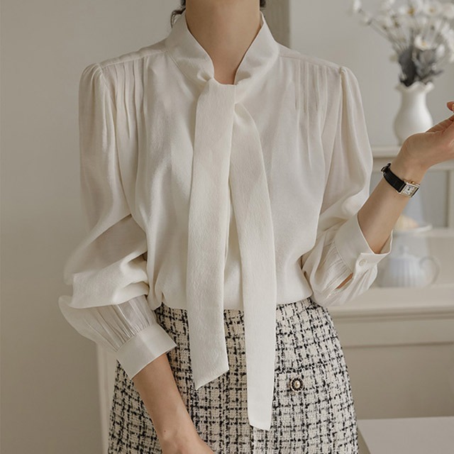 [다잇템]여자 페미닌 잔주름 벌룬 단추 리본 블라우스_3