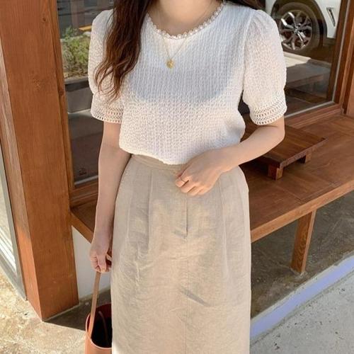 [다잇템][다잇템] 여자 패턴 펀칭 엠보 반소매 벌룬 귀여운 블라우스_23517657_588872
