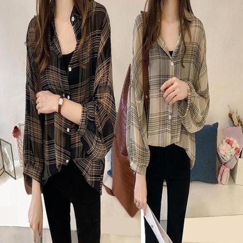 [엄지척]여자 시스루 체크 블라우스 셔츠 벌룬소매 얇은 남방_19645263_667501