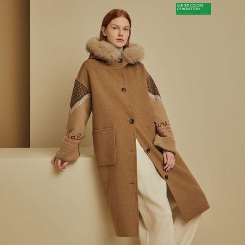 베네통/애플아울렛/쿠스 퍼 트리밍 니트 소매 배색 후드 롱 코트/BACTA9561