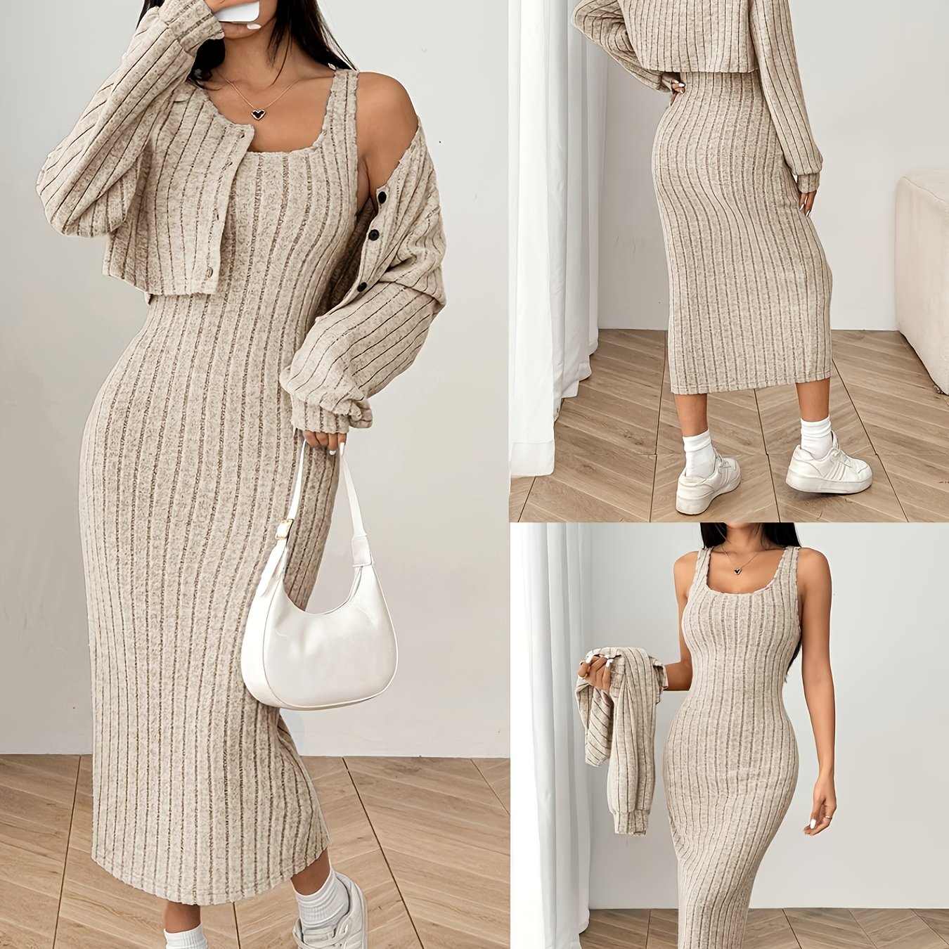 TEMU 가을 가디건 긴팔 숏 탑 + 드레스 세트, 가을/겨울에 완벽, 캐주얼 스타일, 단색, 레귤러 핏, 긴소매, 버튼업, 크루넥, 레귤러 길이, 가을 컬렉션, 캐주얼 복장|캐주얼 스타일|레귤러 핏
