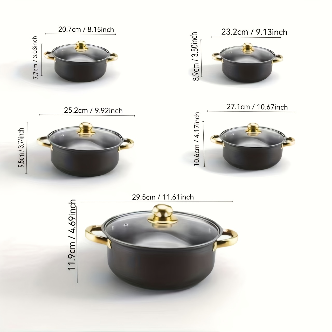 TEMU 스테인리스 스틸 조리기구 세트 - 블랙 외관과 골든 핸들. 다섯 개의 냄비 + 매칭 뚜껑 포함, 인덕션/가스레인지 호환, 기숙사, 캠핑, 주방용. 식기세척기 사용 가능; 크리스마스 선물, 새해 선물, 집들이 선물로 완벽한 다용도 필수품, 기숙사용 조리기구,현대 조리기구,세련된 주방용품,녹 방지 화분,고품질 조리기구,필수 조리기구,홈 셰프,새 집주인