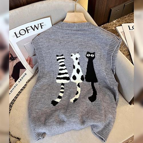 [유니제이] 체페리 고양이 자수 브이넥 조끼