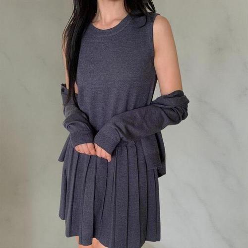 [옷자락]여성 민소매 플레어 벨트 미니 드레스 가디건 세트