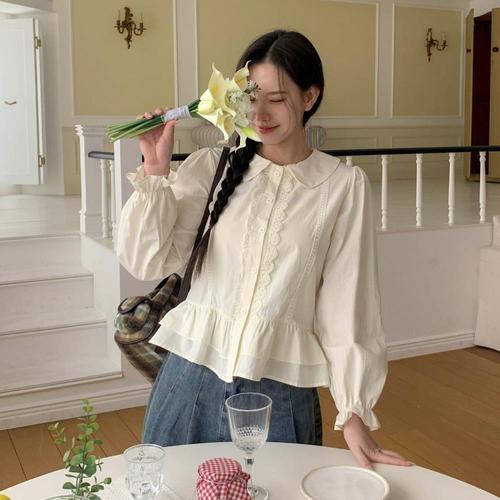 [옷자락] 여자 봄신상 러블리 둥근카라 프릴 레이스 플레어 블라우스