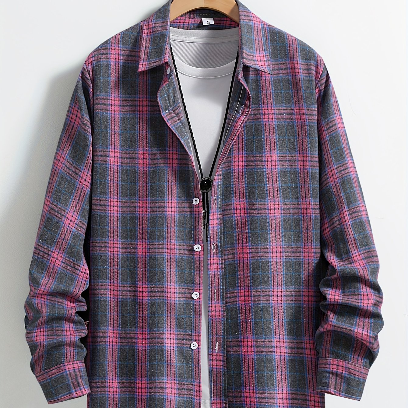 TEMU 남성용 소프트 브러시드 체크무늬 캐주얼 긴팔 셔츠 - 클래식 버튼업 칼라, 신축성이 없는 폴리에스터 원단, 핑크 & 블랙 체크 디자인, 세탁기 사용 가능, 편안한 착용감