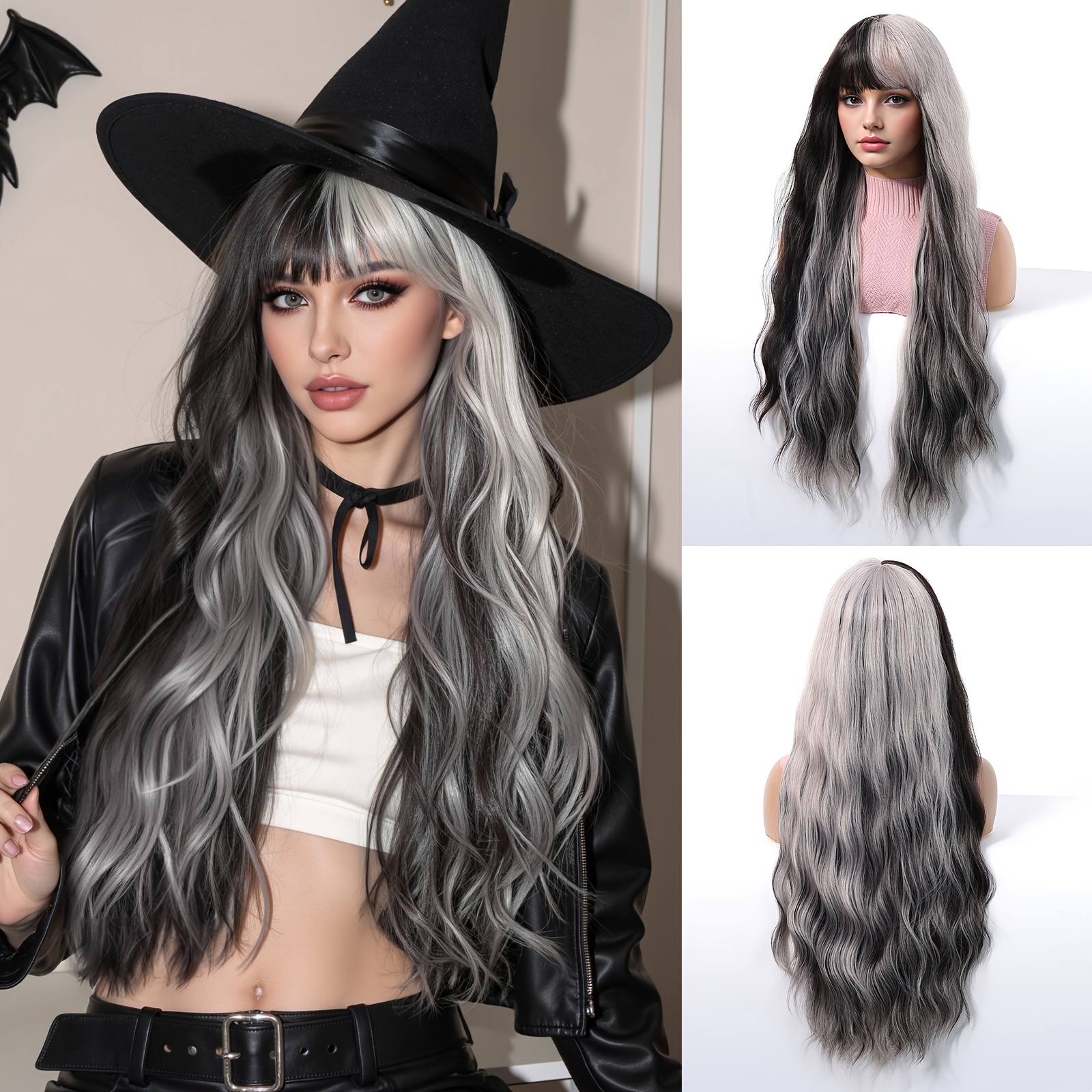 TEMU 30인치 블랙 & 그레이 웨이브 컬리 열에 강한 합성 가발, 조절 가능한 로즈 메쉬 캡 - 150% 밀도 바디 웨이브 텍스처 여성용, 멀티컬러 옵션 (할로윈, 크리스마스, 코스프레) - 염색 가능 & 펌 가능, 편안하고 자연스러운 착용감