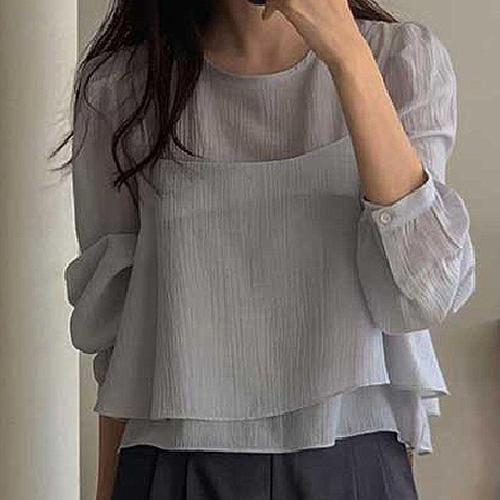 여성 잔주름 플리츠 시스루 블라우스 뷔스티에 레이어드 세트 3색 WFKN9JH