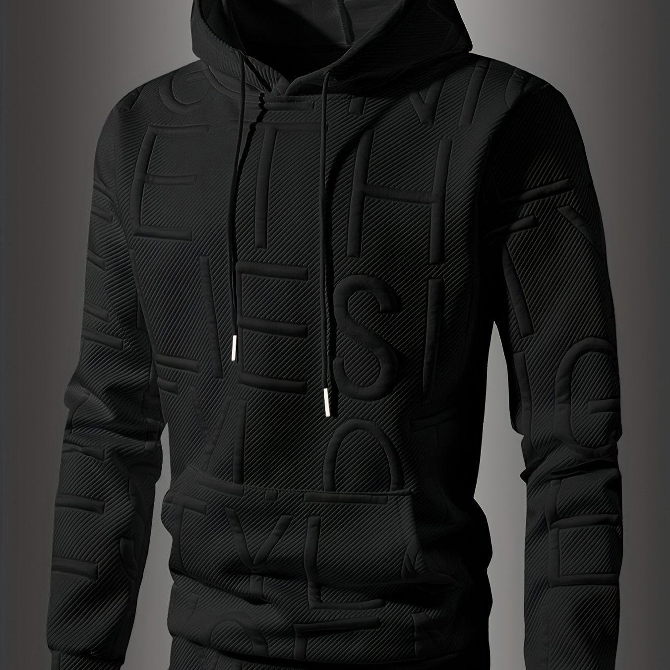 TEMU 남성 캐주얼 블랙 후드 스웨트셔츠, 엠보싱 레터 디자인 - 부드러운 긴소매, 드로스트링 후드와 캥거루 포켓, 봄/가을 시즌에 적합, 오버사이즈 후드티