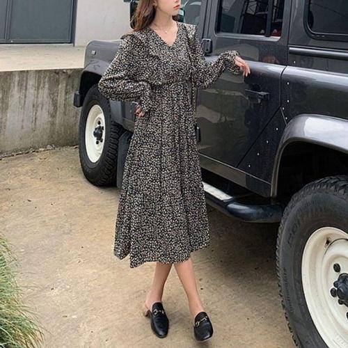 모던 우먼이쁜 플로럴 무늬 브이라인 연출 장팔 롱라인 원피스룩