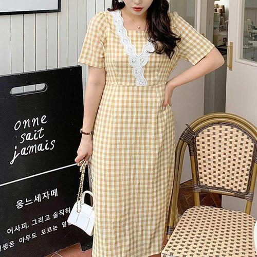 [엄지척]캐주얼 체크패턴 레이스 브이라인 반팔 롱원피스_19912903_667501