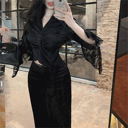[르뚜앙]마시멜 블랙 레이스 셔링 블라우스 스커트 셋업 하객룩 여신핏 투피스 연말 파티룩