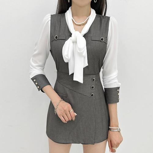 [에이치플러스몰]여성 스트라이프 블라우스 미니 스커트 투피스 2컬러