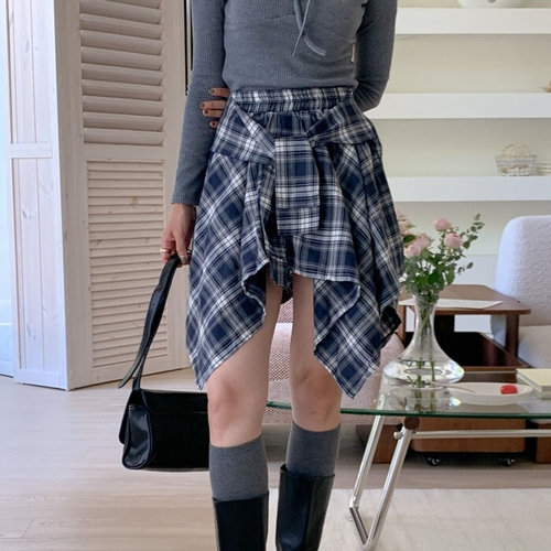 플러리싱 / 체크 매듭 묶음 언발 셔츠 밴딩 미니 스커트 플러리