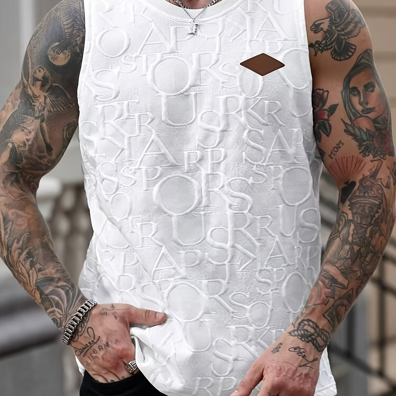 TEMU 남성 여름 레터 자카드 라운드넥 캐주얼 조끼, 가슴 패치 포함, 야외, 휴가에 적합